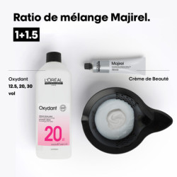 Soit pour un 1 tube de coloration Majirel crème de beauté (60 ml) mélanger avec 90 ml d'oxydant crème L'Oréal Professionnel de votre choix selon le niveau d'éclaircissement souhaité (1+1,5) : - 12,5 vol. (3,75%), jusqu'à 1 niveau d'éclaircissement.