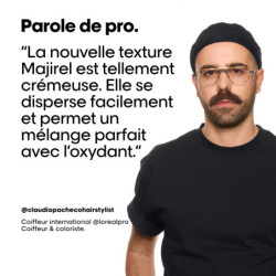 Soit pour un 1 tube de coloration Majirel crème de beauté (60 ml) mélanger avec 90 ml d'oxydant crème L'Oréal Professionnel de votre choix selon le niveau d'éclaircissement souhaité (1+1,5) : - 12,5 vol. (3,75%), jusqu'à 1 niveau d'éclaircissement.