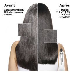 Soit pour un 1 tube de coloration Majirel Cool Cover (60 ml) mélanger avec 90 ml d'oxydant crème L'Oréal Professionnel de votre choix selon le niveau d'éclaircissement souhaité (1+1,5) :